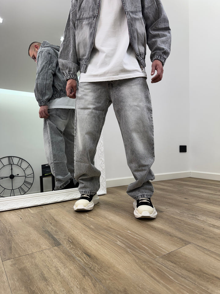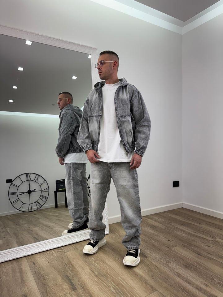 Questo coordinato in denim lavaggio grigio chiaro è composto da una giacca con zip e cappuccio abbinata a dei jeans baggy. Perfetto per un look casual e rilassato, è realizzato con tessuti di alta qualità che garantiranno comfort e resistenza. Aggiungi un tocco bohemian al tuo guardaroba con questo coordinato.