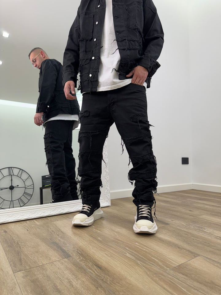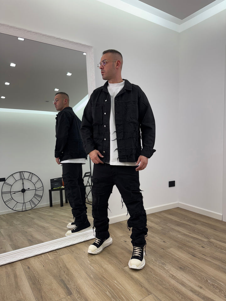 Esalta il tuo stile con il Coordinato Queens in denim giacca e jeans baggy lavaggio nero sfrangiato. Realizzato in pregiato denim, questo elegantissimo coordinato ti farà risaltare in ogni occasione. Con taglio moderno e sfrangiature trendy, sarai sempre al passo con la moda.