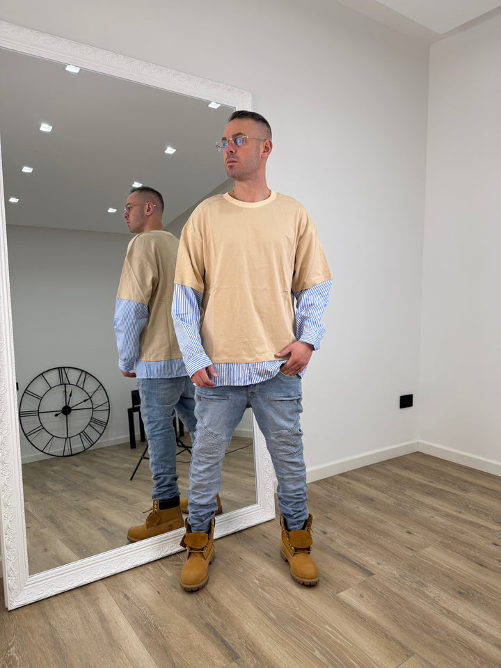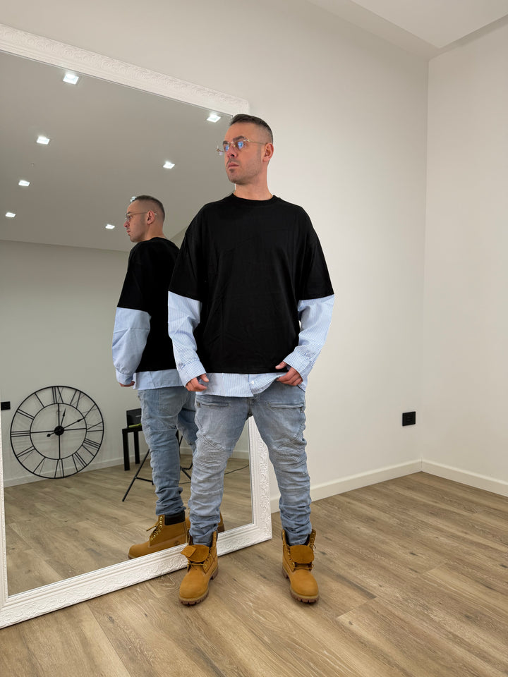 Maglietta a maniche lunghe con struttura e dettagli ispirati alla camicia classica. Realizzata con materiali di qualità, combina il comfort della t-shirt con l'eleganza formale della camicia tradizionale. Perfetta per chi ricerca uno stile versatile e sofisticato, adatta sia a occasioni casual che semi-formali. Un capo essenziale che eleva il guardaroba con semplicità e carattere.