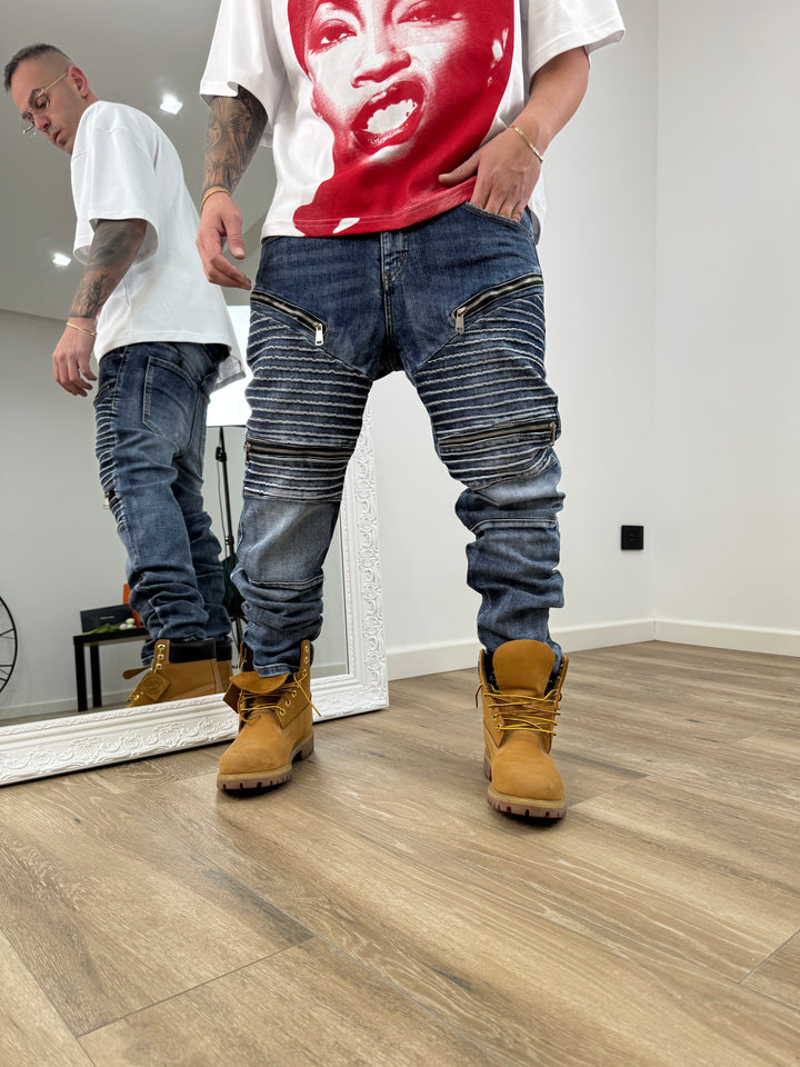 Questi jeans biker in denim blu lavato presenta delle zip e sono perfetti per uno stile casual ma alla moda. Realizzati con materiale di alta qualità, offrono comfort e resistenza garantiti. Aggiungi un tocco di stile alla tua collezione di abbigliamento con questi jeans moderni e versatili.