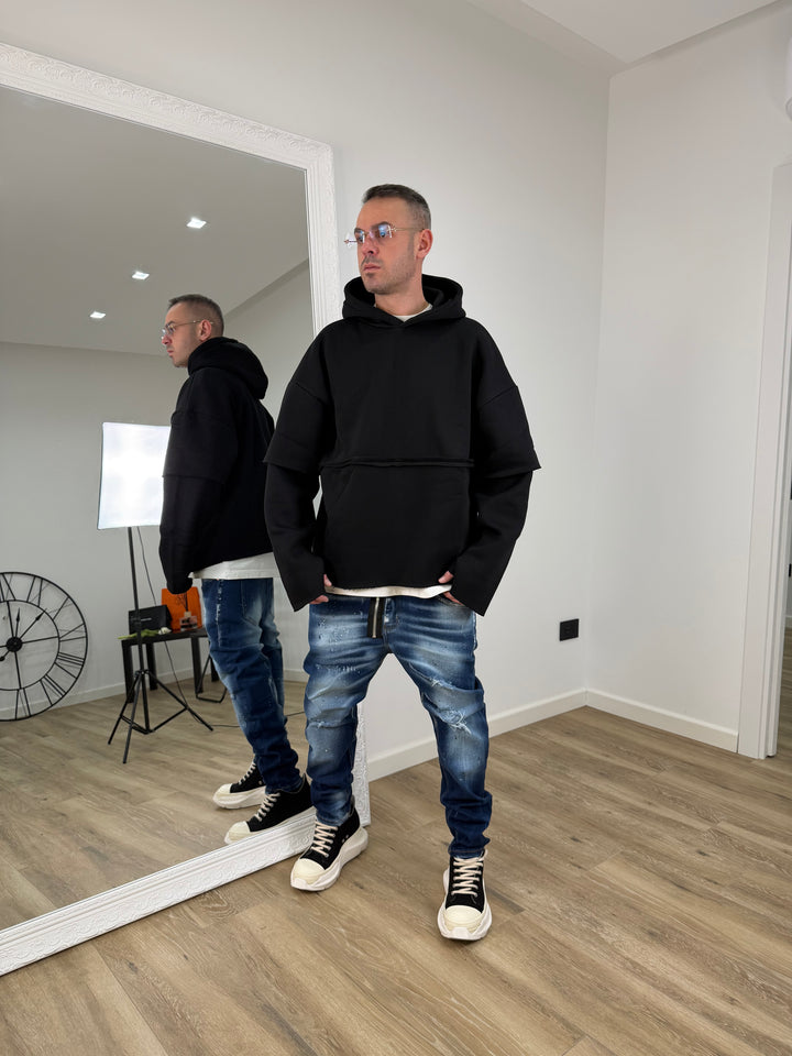 Felpa con cappuccio realizzata con doppia manica caratterizzata da un taglio vivo che esalta il design contemporaneo. La manica a quanto conferisce un'estetica ricercata e moderna, perfetta per chi ricerca capi dal dettaglio costruttivo sofisticato. Il cappuccio garantisce praticità e comfort, mentre la lavorazione delle maniche rappresenta un elemento distintivo che eleva il capo dal quotidiano. Ideale per uno stile urbano consapevole e attento ai particolari costruttivi.