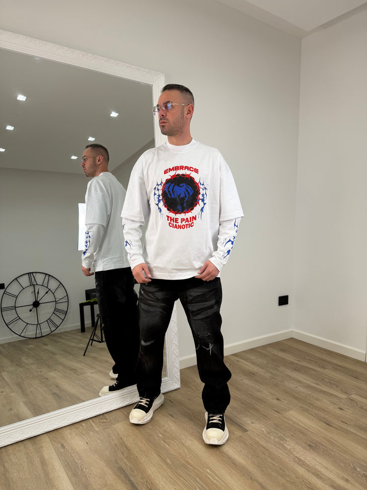 T-shirt in cotone con design innovativo a doppia manica, perfetta per chi ricerca uno stile contemporaneo e distintivo. La stampa EMBRACE CNTC sul petto aggiunge carattere e personalità al capo. Realizzata con materiali di qualità, garantisce comfort durante tutto il giorno. Ideale per chi vuole distinguersi con un'estetica moderna e ricercata. Un pezzo versatile che si adatta a molteplici occasioni, dal casual al semi-formale.